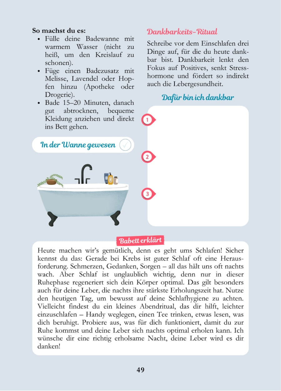 Dieses einzigartige und wunderschön gestaltete Praxis-Workbook von Dr. Babett Baraniec (promovierte Biologin, Medizinpädagogin und selbst seit über 12 Jahren metastasierte Krebspatientin) zeigt dir, wie du deine Leber innerhalb von nur 14 Tagen nachhaltig stärken kannst.
